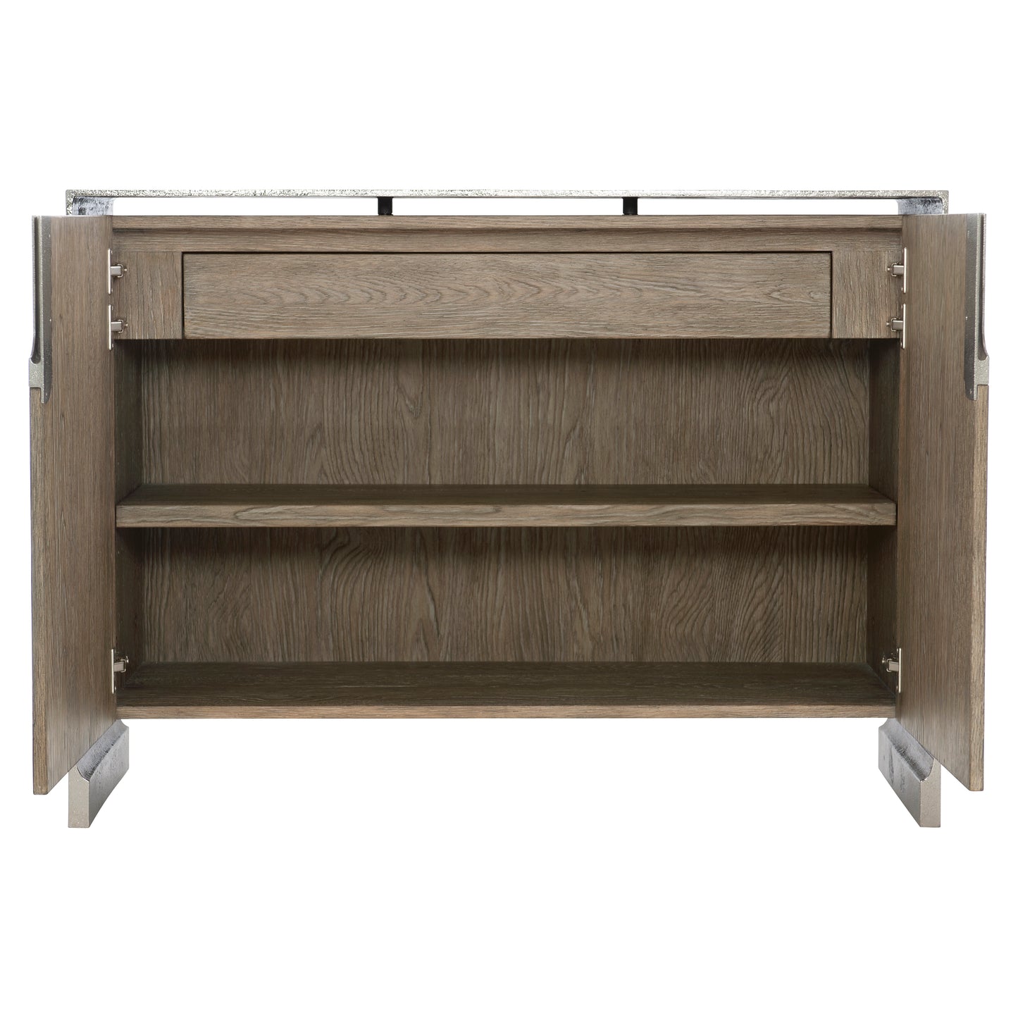- Two soft-close doors with recessed metal finger pull. Behind doors is one soft-close drawer with finger pull, one adjustable/removable shelf and fixed bottom shelf surface.
