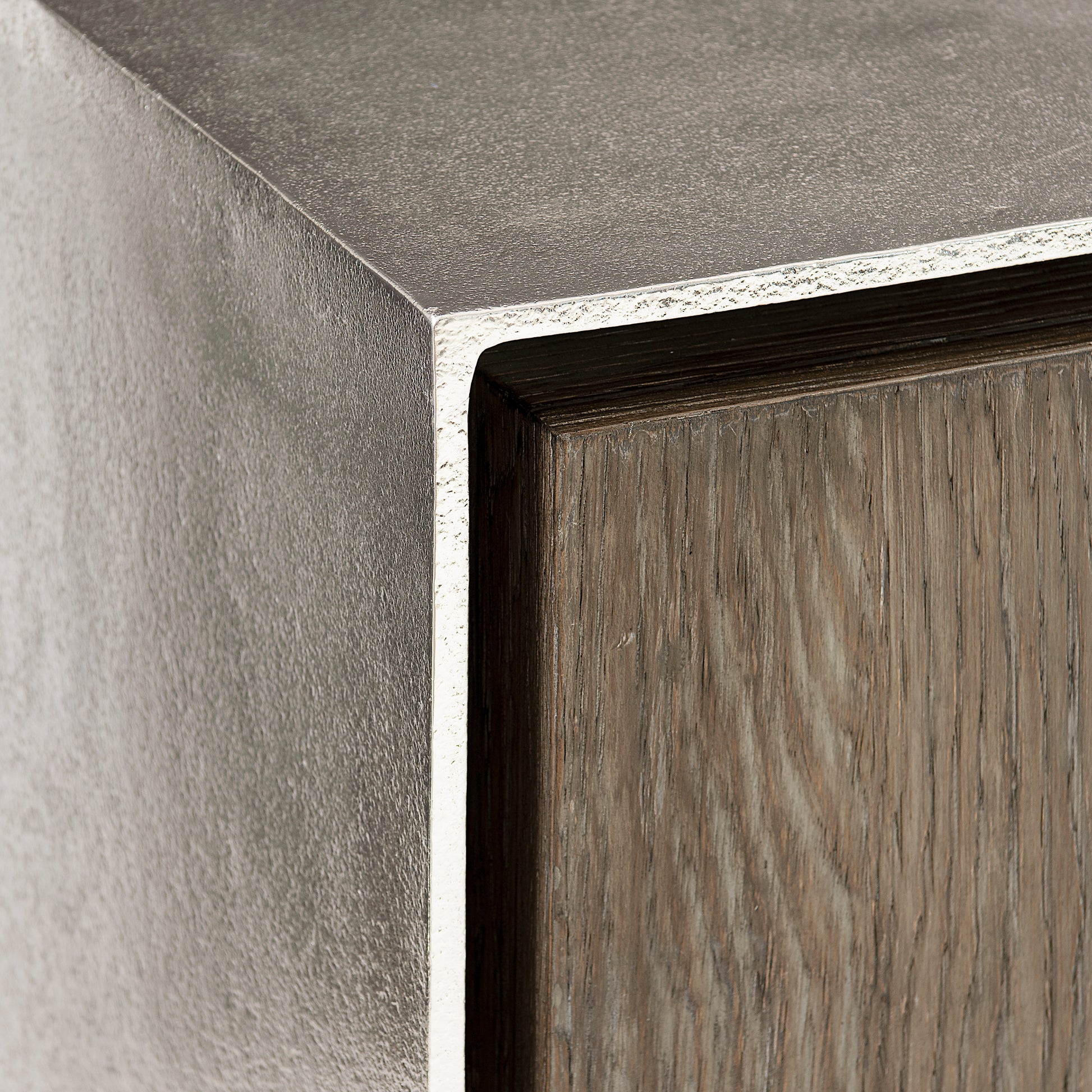 - White oak veneer inner case in Tamarind finish. Cast aluminum outer case in shiny nickel finish.