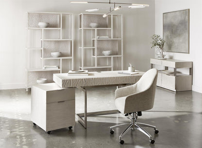 - Weathered Bone finish on wood frame and on staggered cast back panels in chiseled pattern