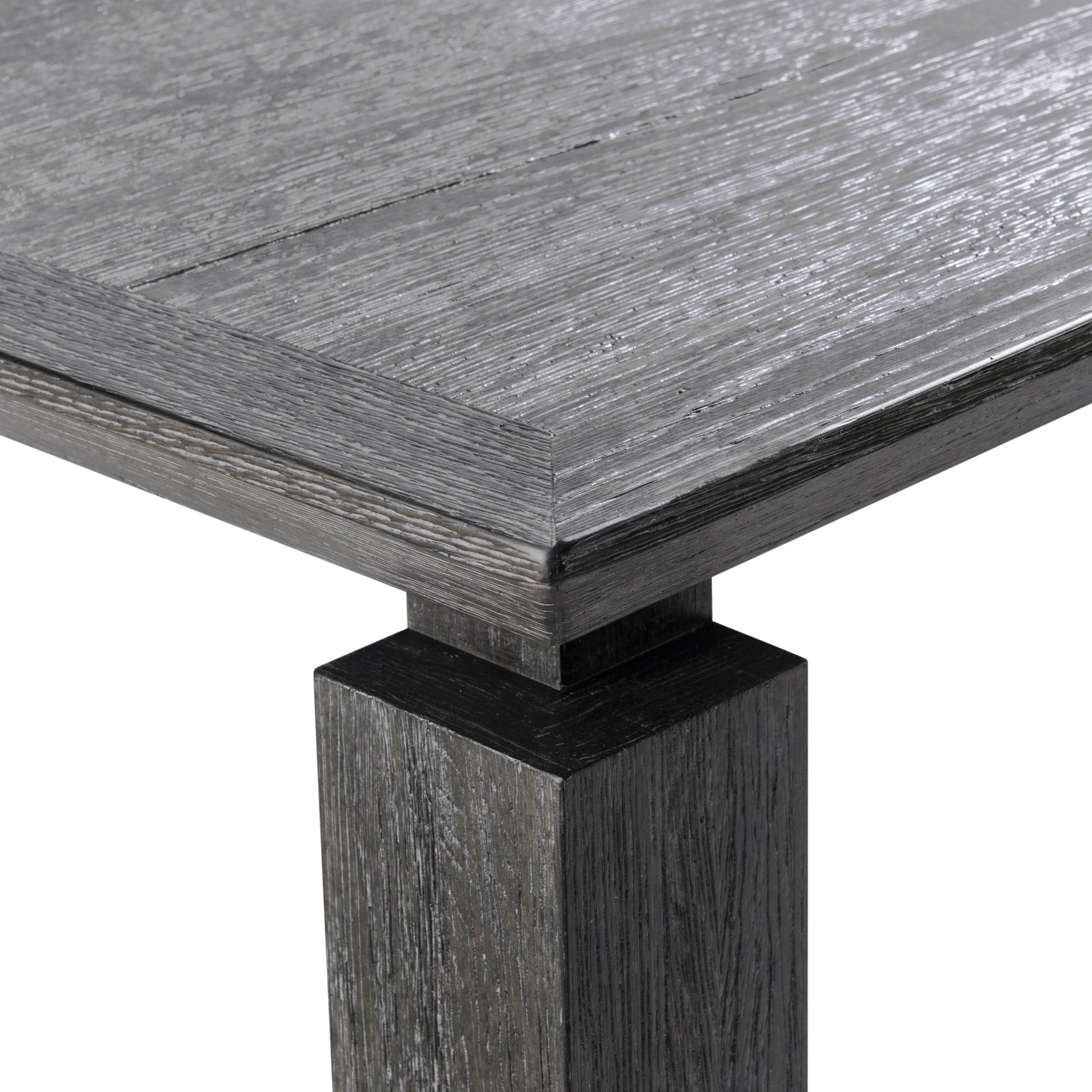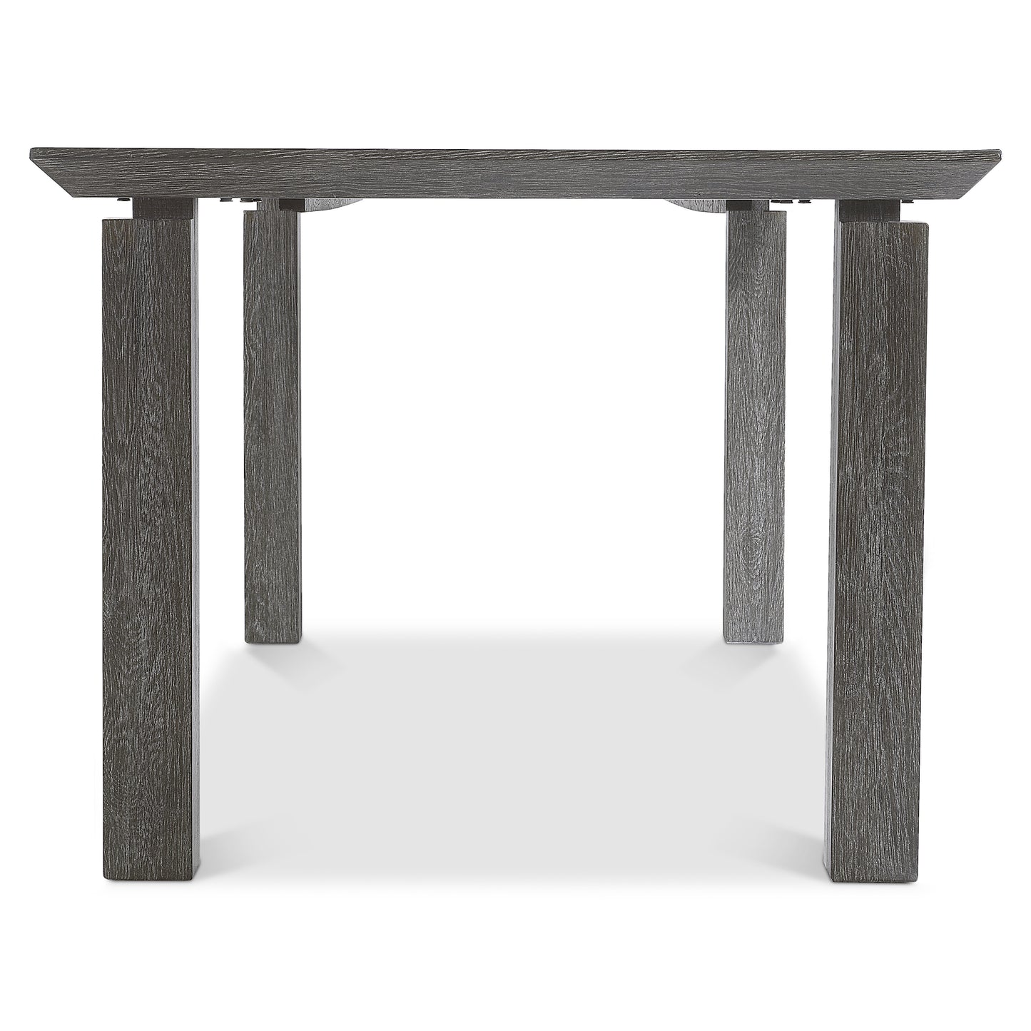 - Chamfered-edge table top supported by four block legs with notch detail