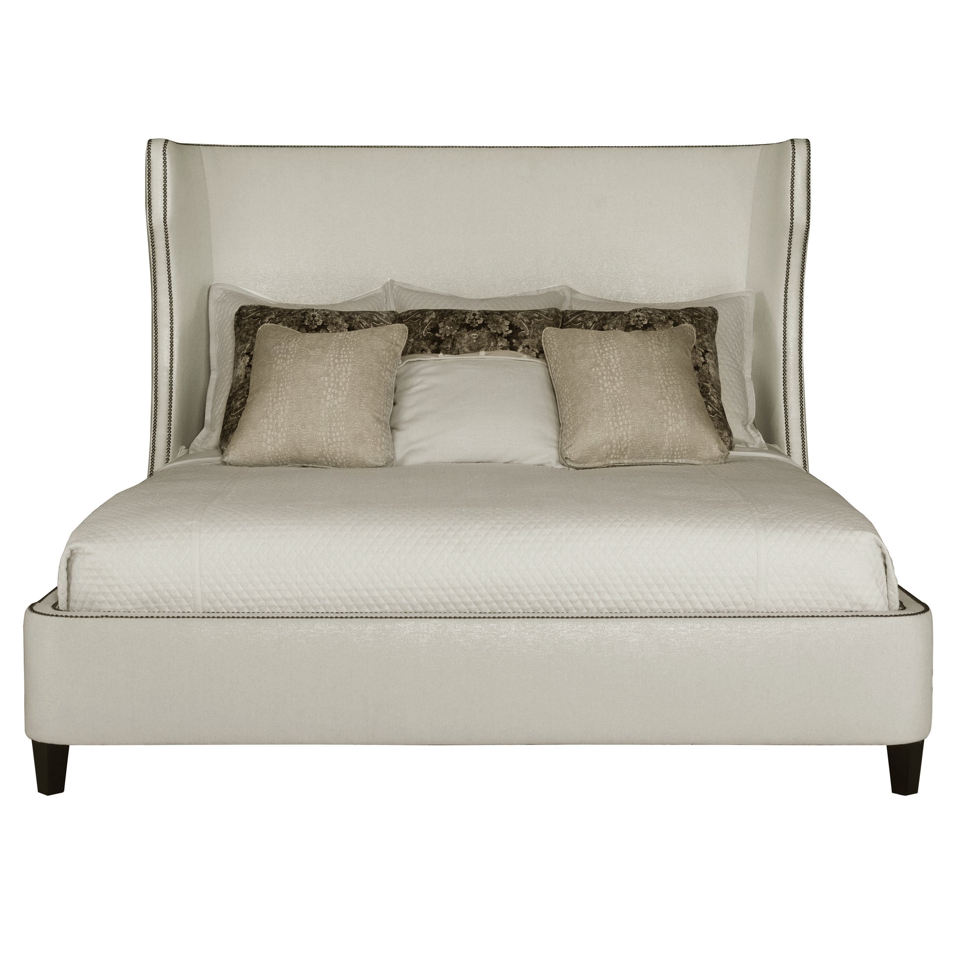 - Slightly bowed, upholstered headboard with wings and nailhead trim
