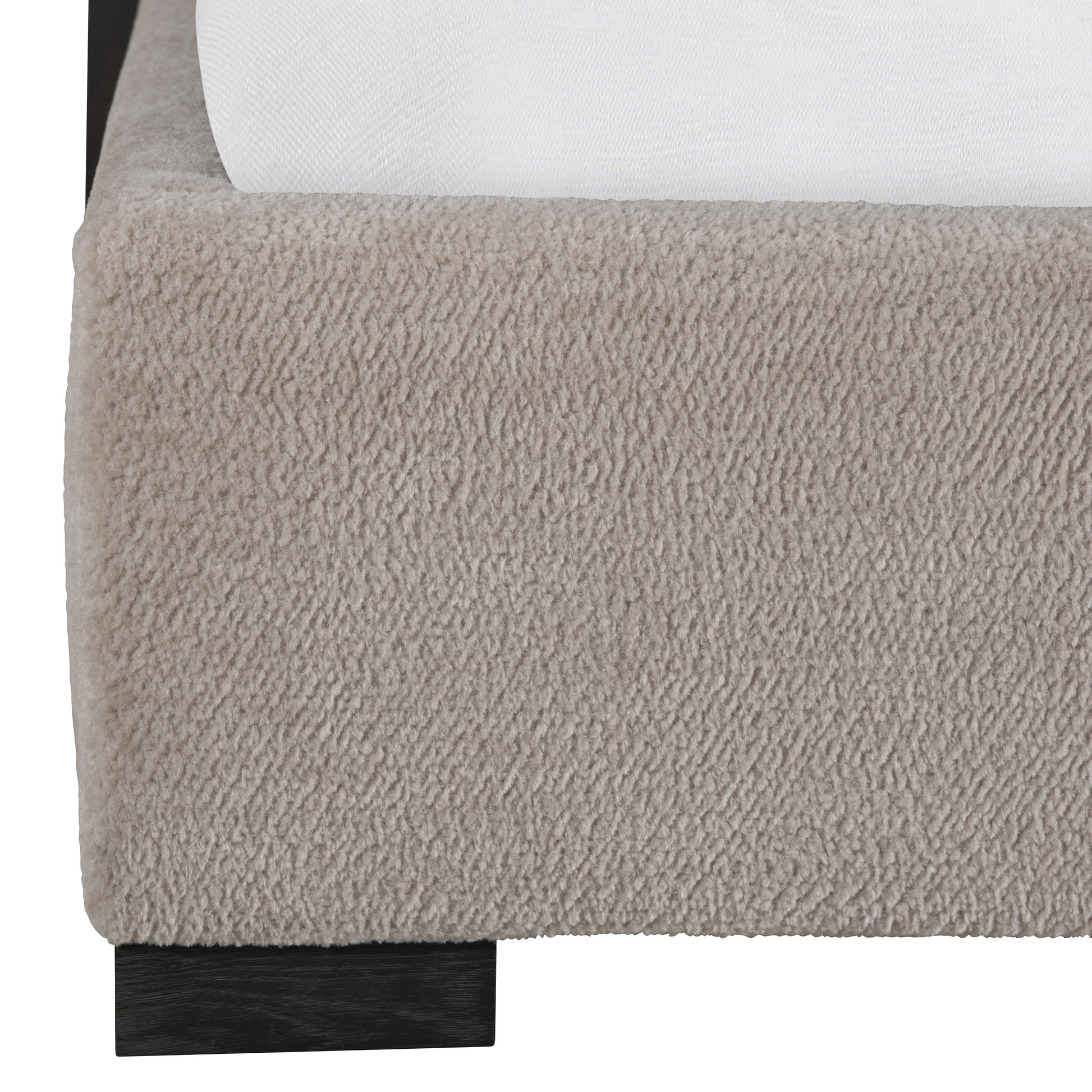 - Upholstered headboard, footboard and side rails with wood feet in Ebonized Pine finish