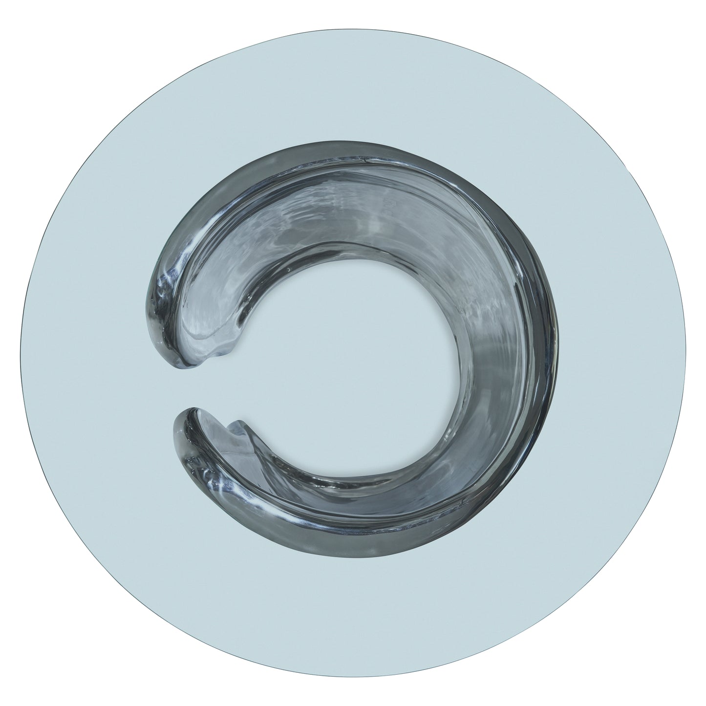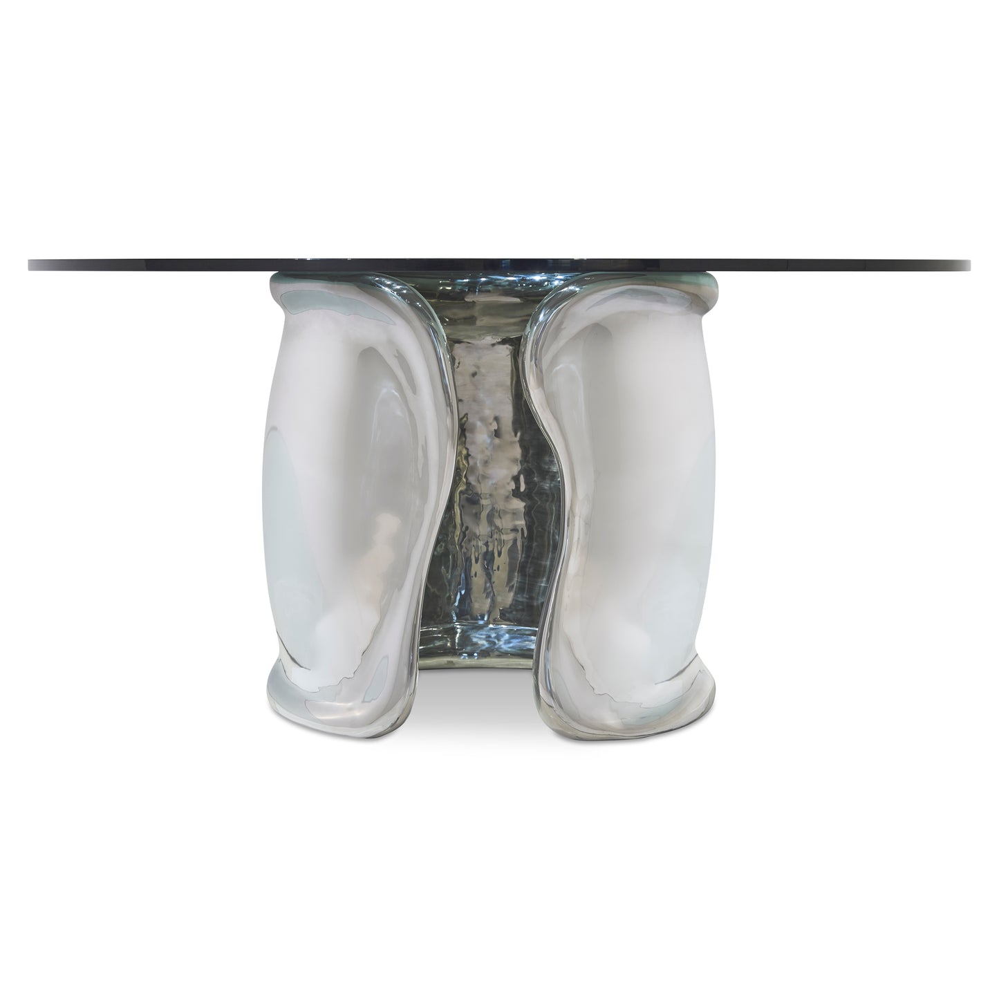 - 54" round glass top on sculpted cast metal base in Polished Stainless Steel finish